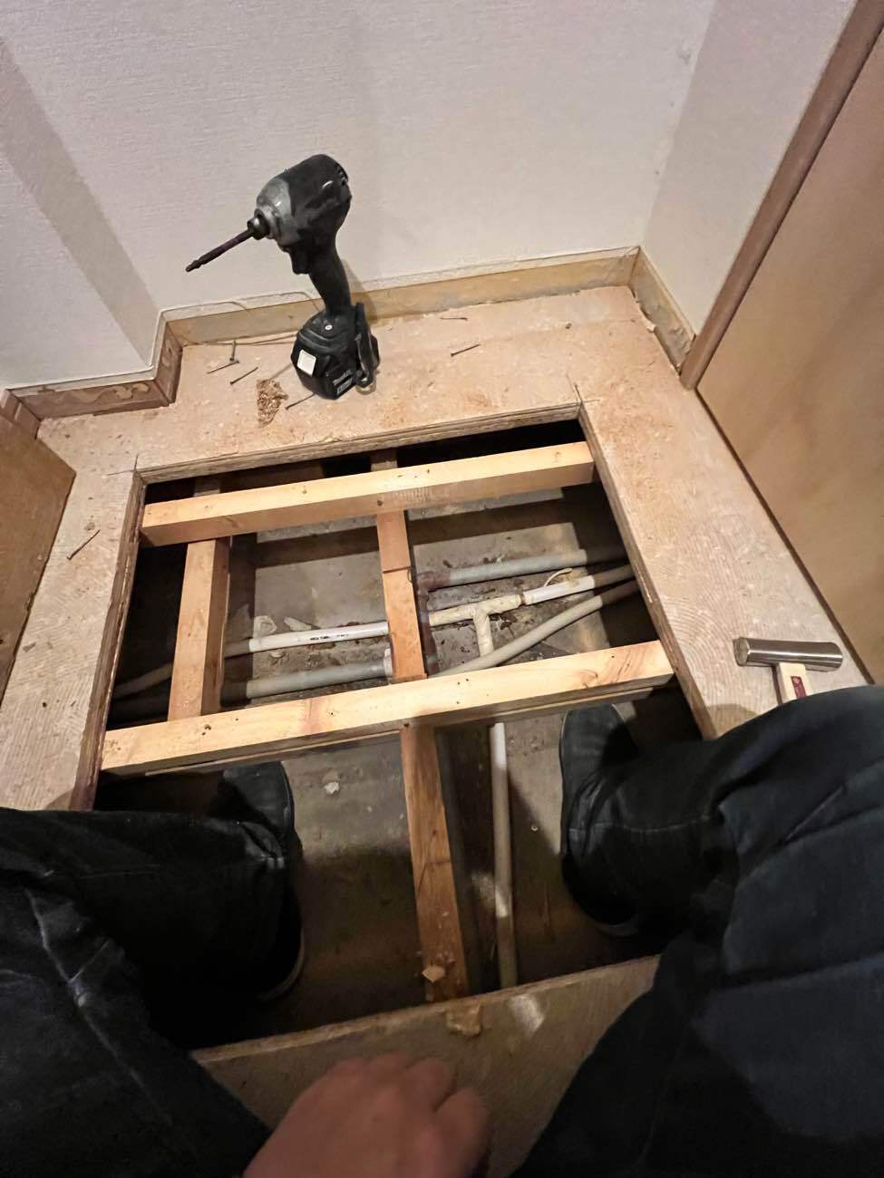 上階にお住まいの入居者様にお話しさせていただき、調査を開始。 怪しい箇所の床を部分的に開口して確認したところ、原因は**給湯管(お湯の配管)に生じたピンホール(小さな穴)**でした。