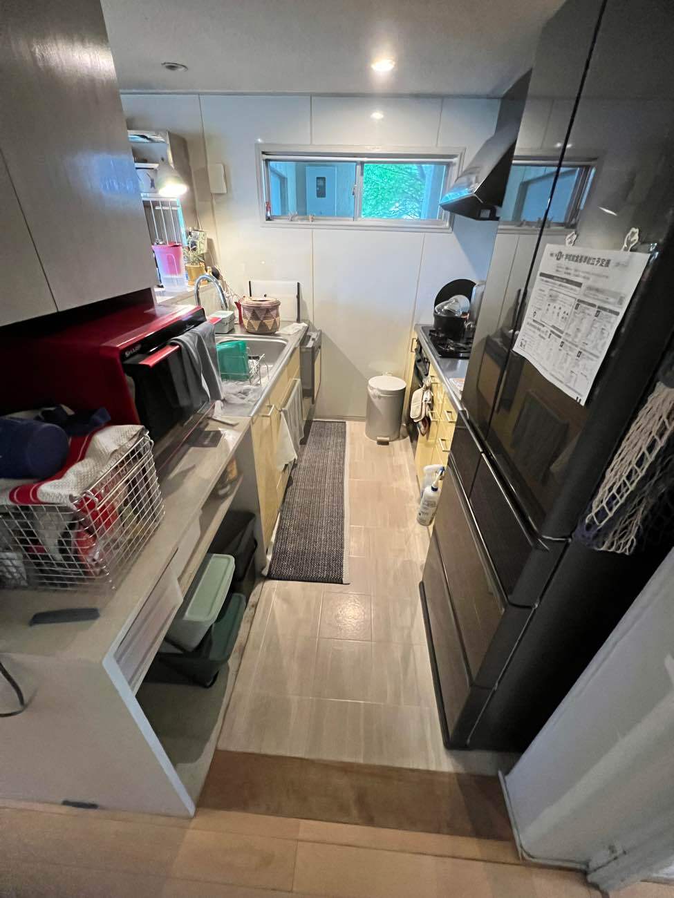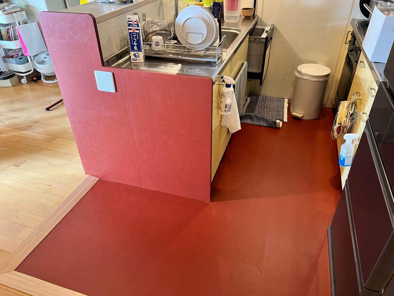 アクセントフロア: キッチン床には、鮮やかな赤色のフロアタイルを施工。